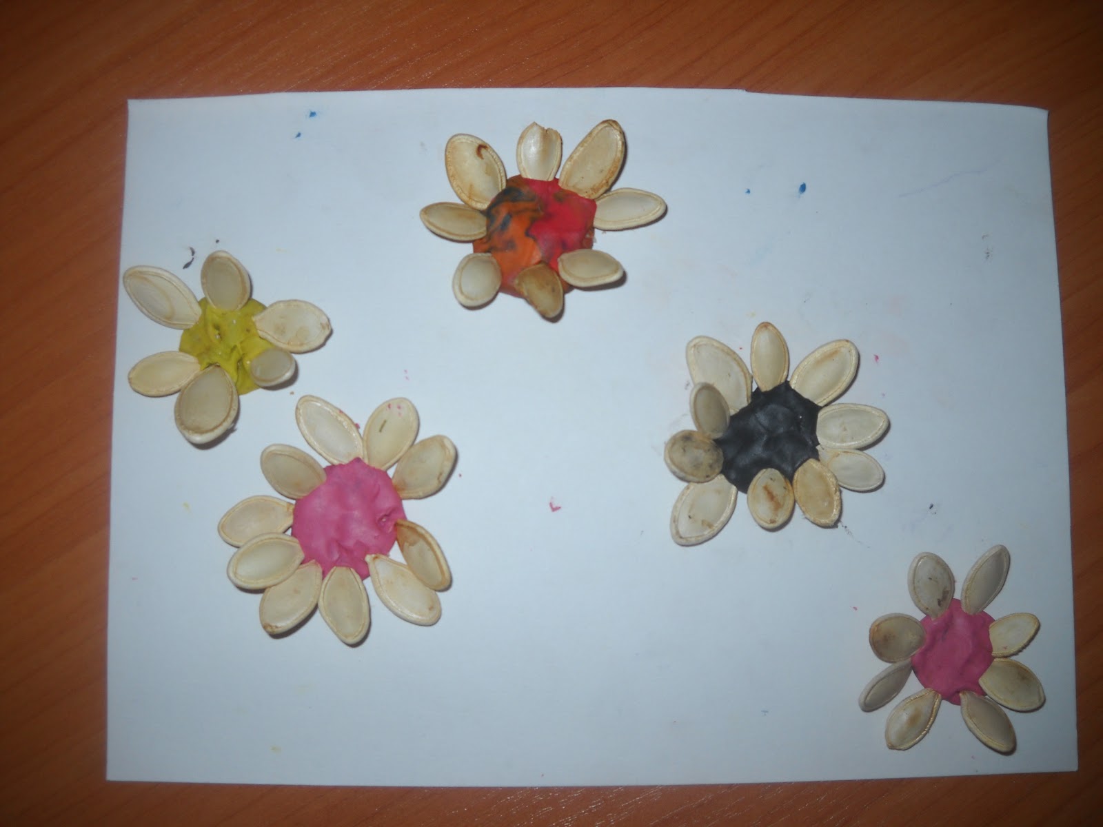 | Пластилин и тыквенные семечки. Вообще планировалось делать вазу с цветами, но Настя переделала под цветочную полянку, упростила задание))) |